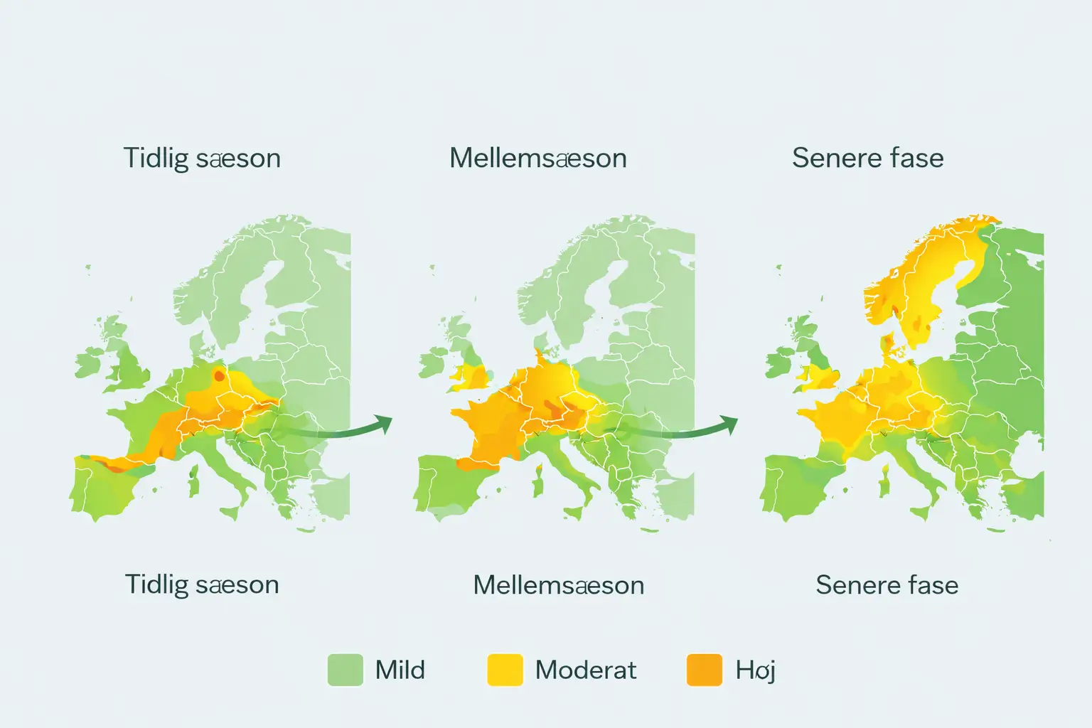 - Senere fase: Udbredt pollen i det meste af Europa, inklusive nordlige regioner